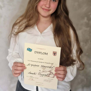 W piątek, 20 marca, uczennica klasy VIII, Amelia Grygiel, dzielnie reprezentowała naszą szkołę w konkursie ortograficznym „O pióro Starosty Kaliskiego". Konkurs przeznaczony był dla uczniów szkół podstawowych powiatu kaliskiego.
