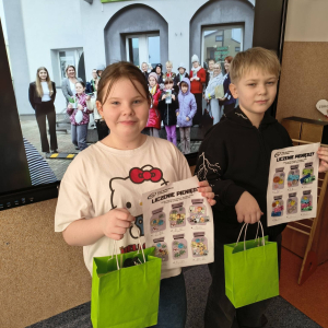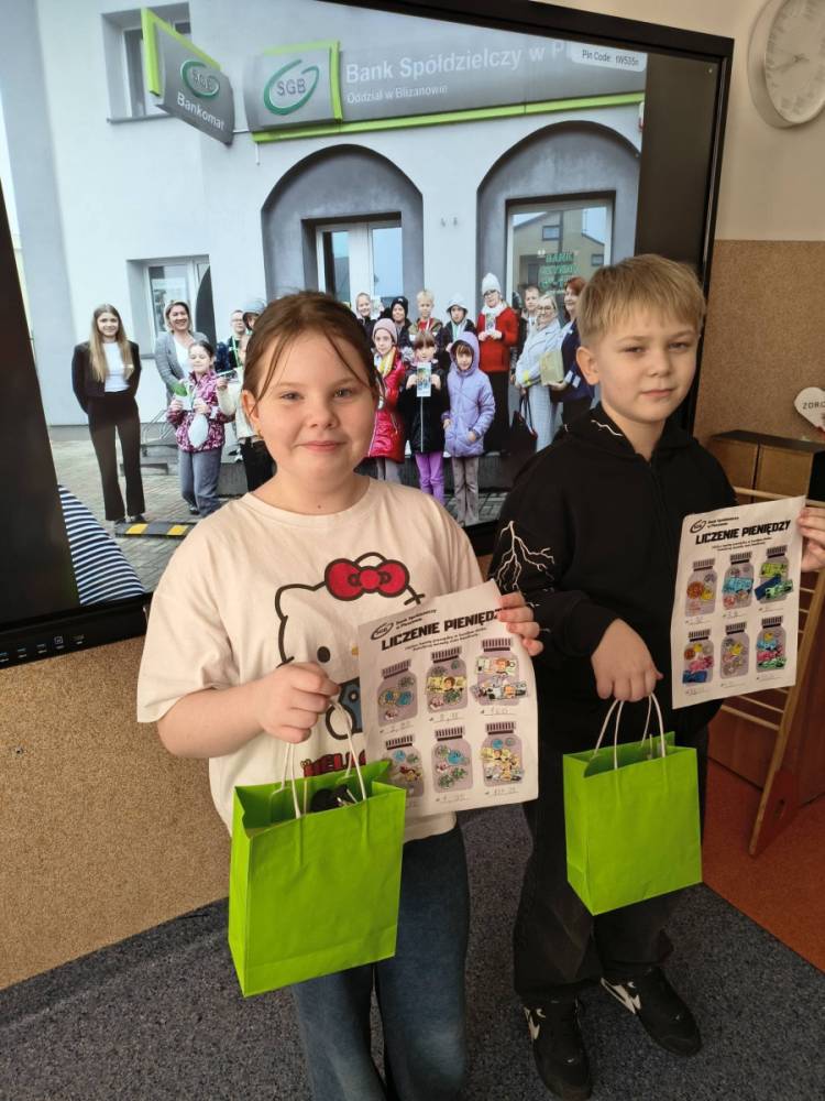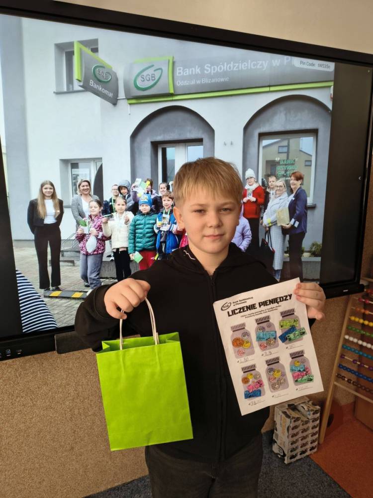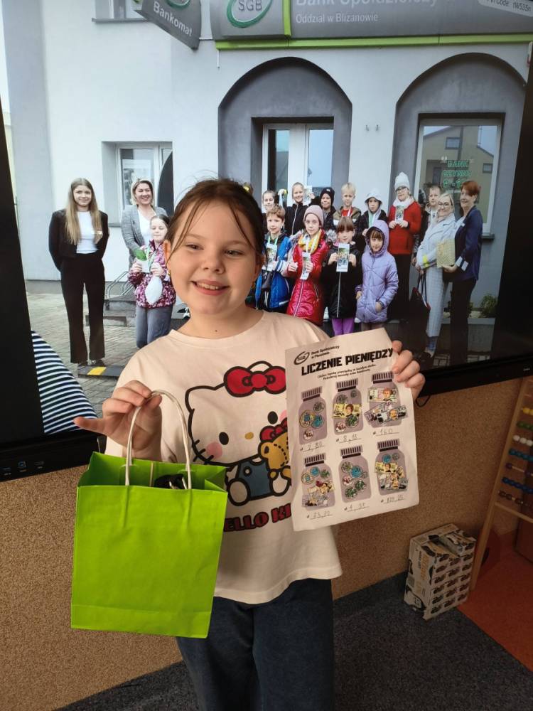 Choć pieniądze to nie wszystko, to jednak warto coś o nich wiedzieć. Dlatego też w środę, 15 października 2025 r. Bank Spółdzielczy w Pleszewie - Oddział w Blizanowie odwiedziła klasa IIIa wraz z wychowawczynią. Prócz wielu ciekawych i praktycznych informacji, które przekazane zostały uczniom przez pracowników banku, trzecioklasiści wzięli również udział w konkursie. Zadaniem dzieci było poprawne przeliczenie pieniędzy w karcie pracy oraz staranne pokolorowanie obrazków, przedstawiających monety oraz banknoty.